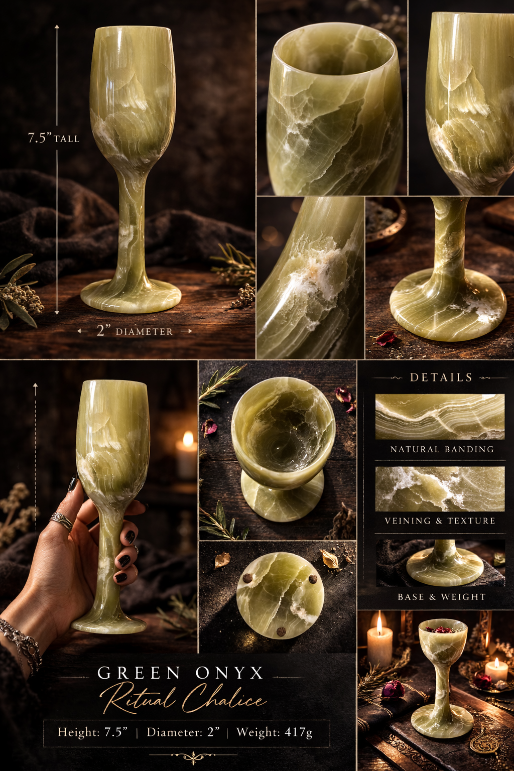 This Green Onyx Ritual Chalice stands 7.5 inches tall and weighs 417 grams – substantial in hand, grounded on the altar. The stone carries layered bands of soft olive, pale cream, and flowing mineral veins that feel ancient rather than ornamental.