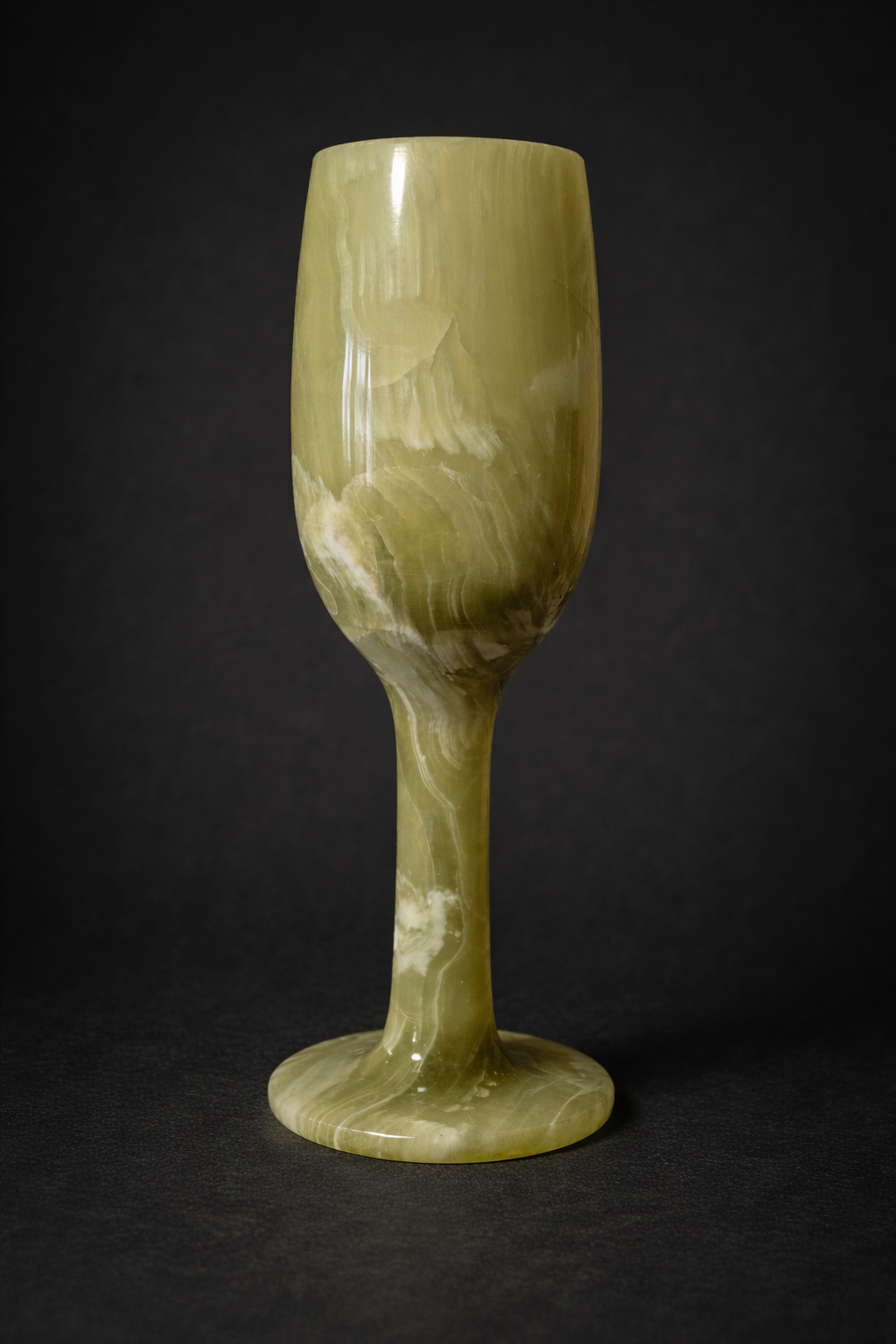 Carved from luminous green onyx, this 7.5 inch ritual chalice carries the weight and quiet authority of a ceremonial object. With natural banding in olive and cream, each vein moves like memory through stone.